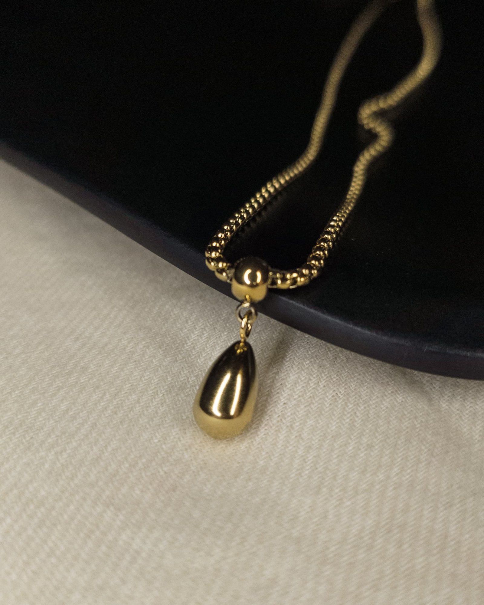 The mesmerizing teardrop-shaped pendant, made from durable stainless steel and plated in lustrous gold, adds a touch of sophisticated style to any look. The minimalist design allows the pendant to seamlessly complement a wide range of outfits, making it the perfect accessory for the modern, fashion-conscious individual.