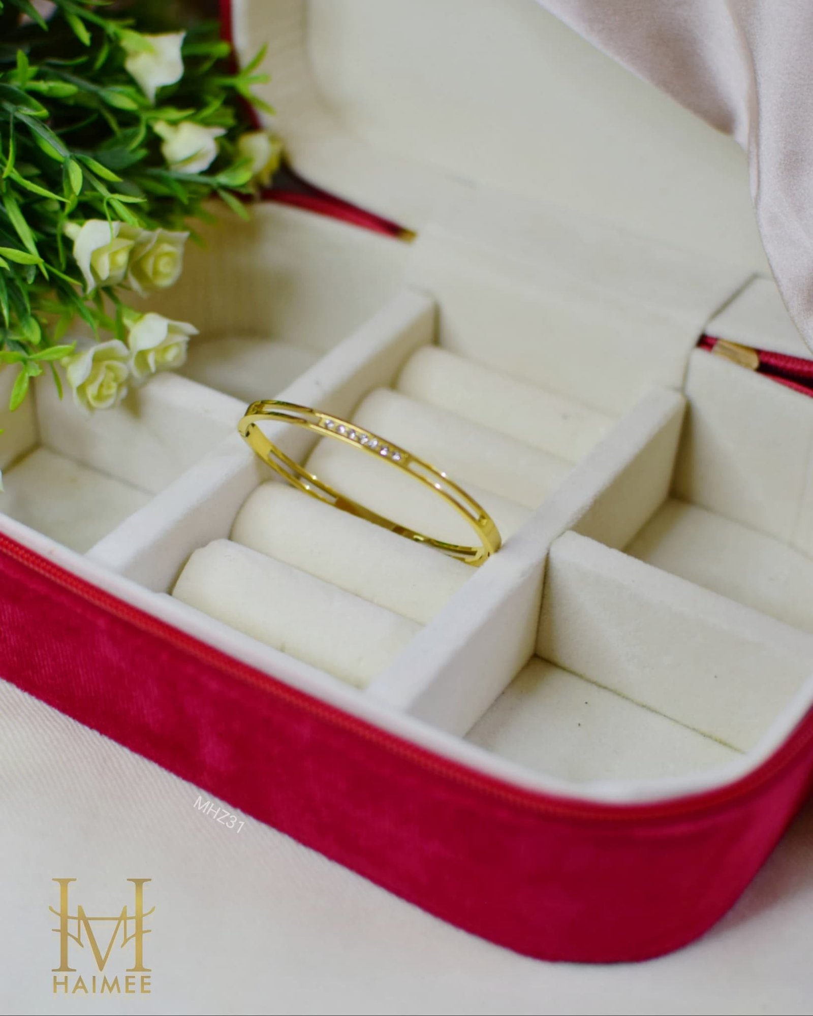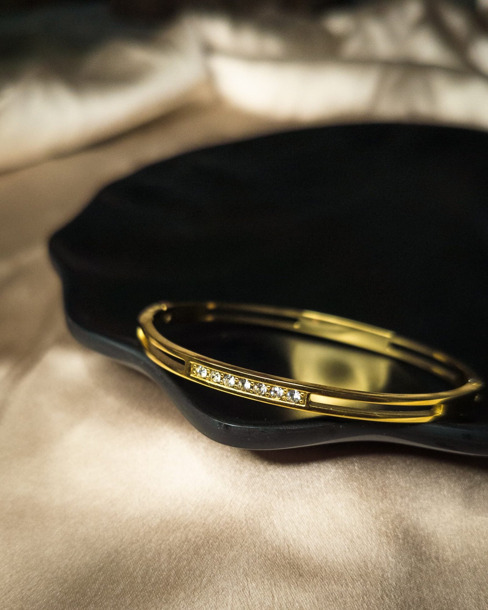 Invest in a piece that not only captures the essence of timeless elegance but also stands the test of time. Crafted to withstand the rigors of daily wear, our premium anti-tarnish gold-plated stainless steel openable bracelet with cubic zirconia is a testament to enduring quality and sophisticated taste. Experience the epitome of luxurious simplicity and make a statement with this truly exceptional accessory.