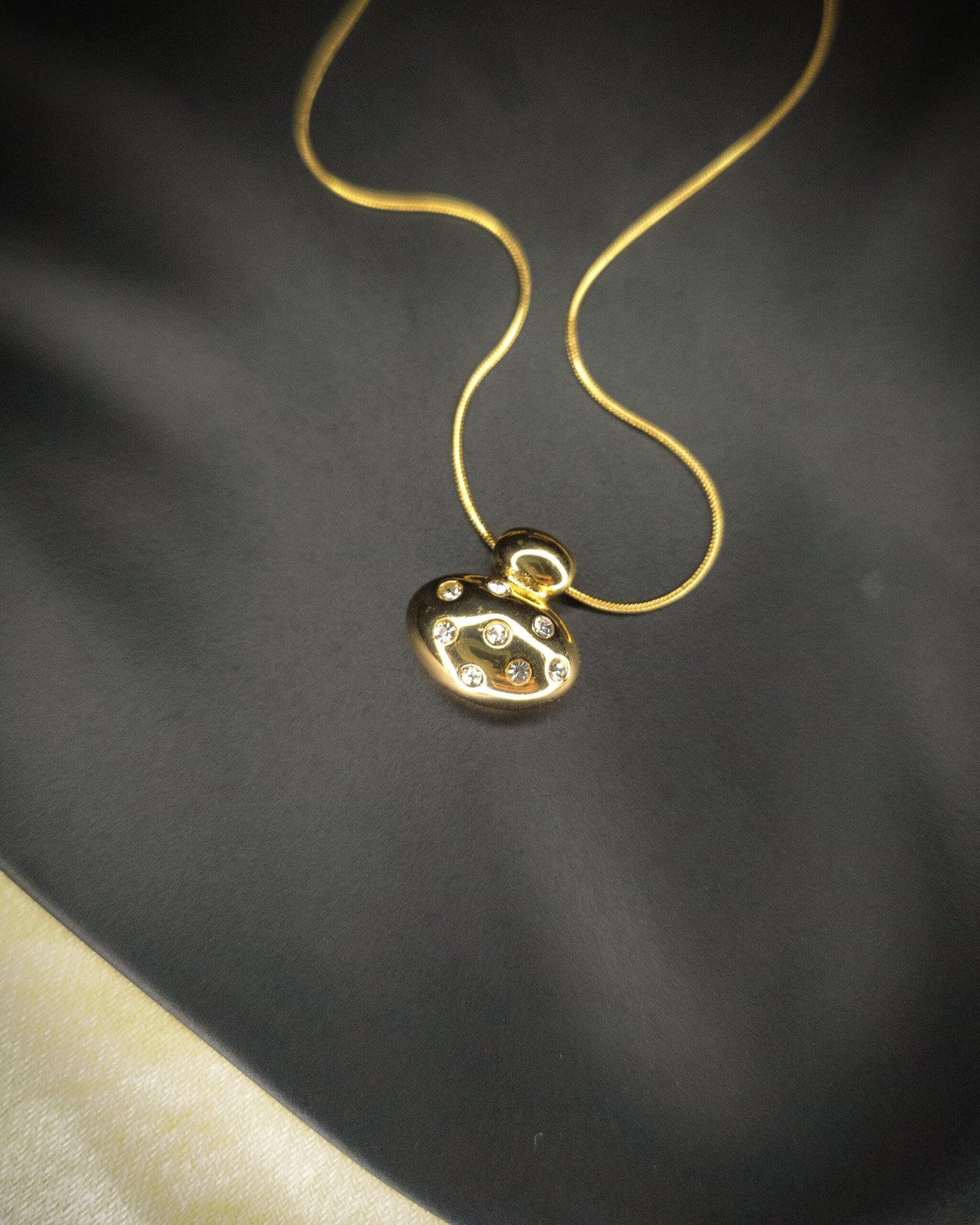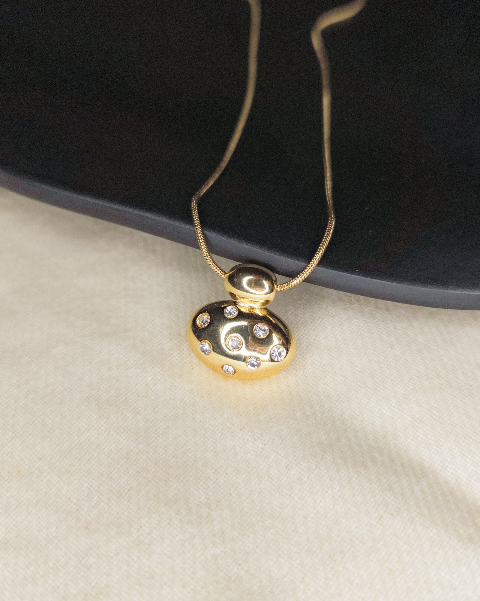 Enhance your jewelry collection with this anti tarnish gold-plated minimalist pendant necklace, a perfect blend of modern artistry and luxurious craftsmanship. The pendant’s sculptural design, inspired by organic shapes, is adorned with sparkling embellishments, creating a refined look that balances simplicity with elegance.