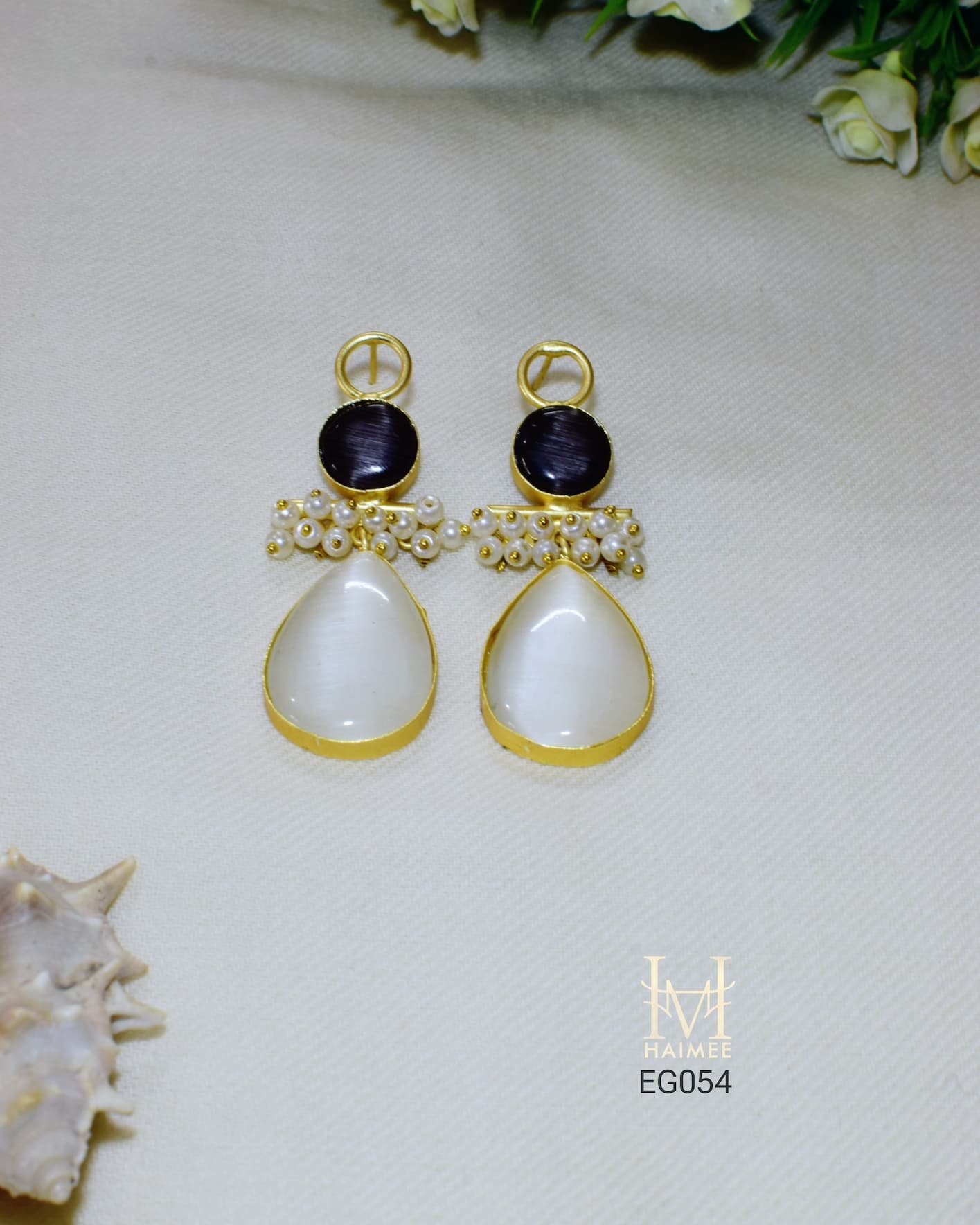 - Elegant gold-plated drop earrings featuring a stunning Monalisa stone and pearl accents