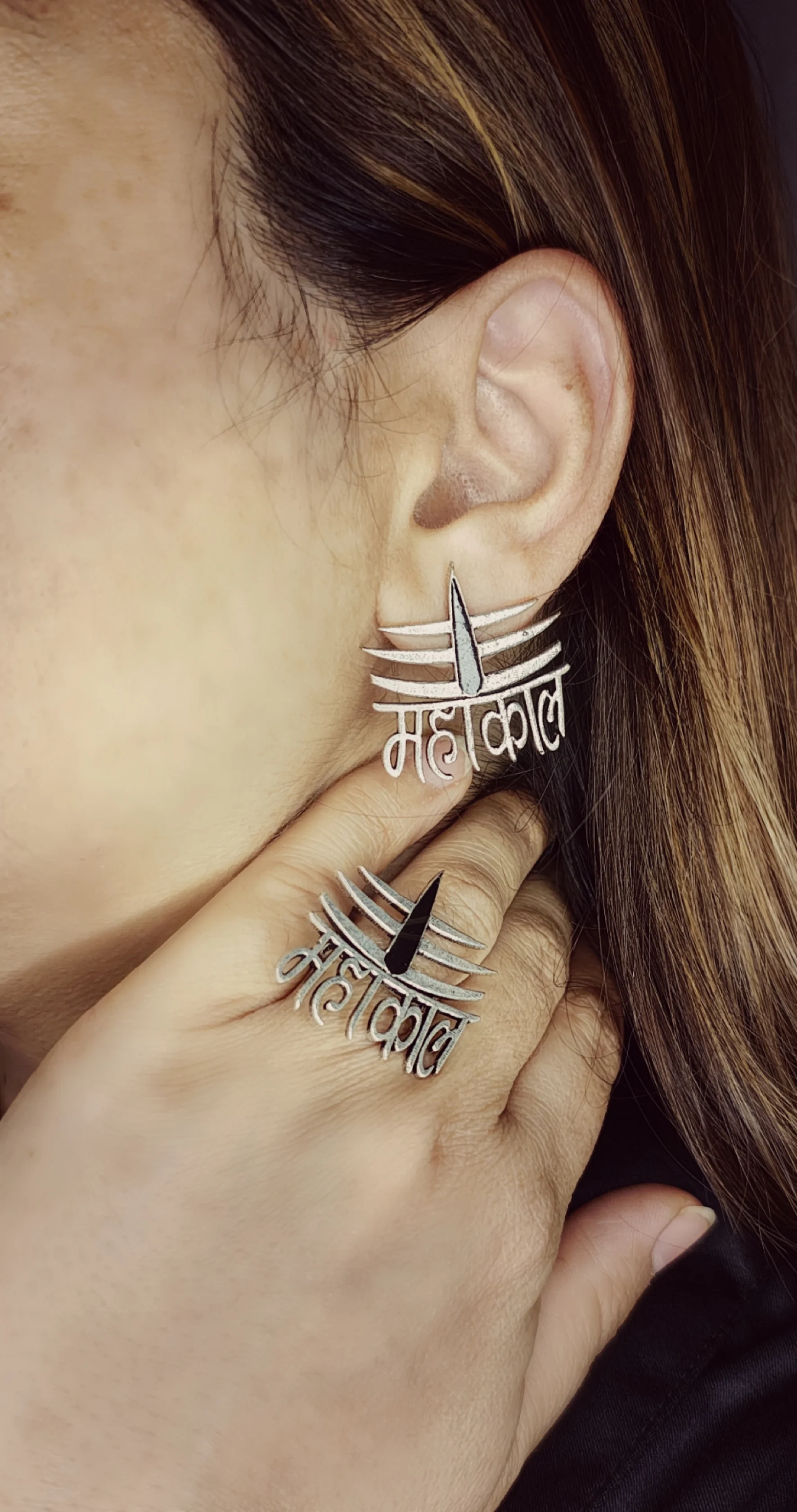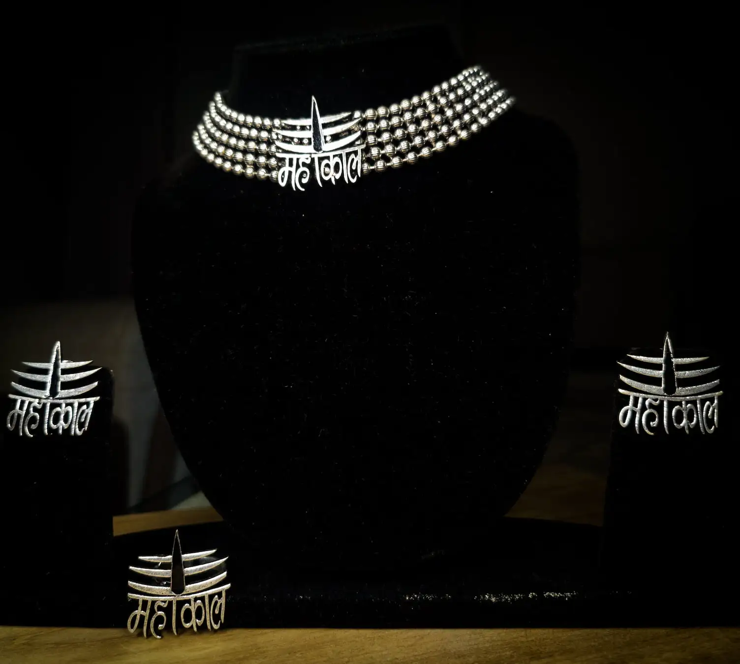Crafted on a sturdy brass base and finished in rich antique silver, this choker features the sacred “महाकाल” script and Trishul motif, embodying the essence of Lord Shiva — fierce, eternal, and boundless. The multi-layer beaded design wraps gracefully around the neck, symbolising the rhythm of strength and spirituality.