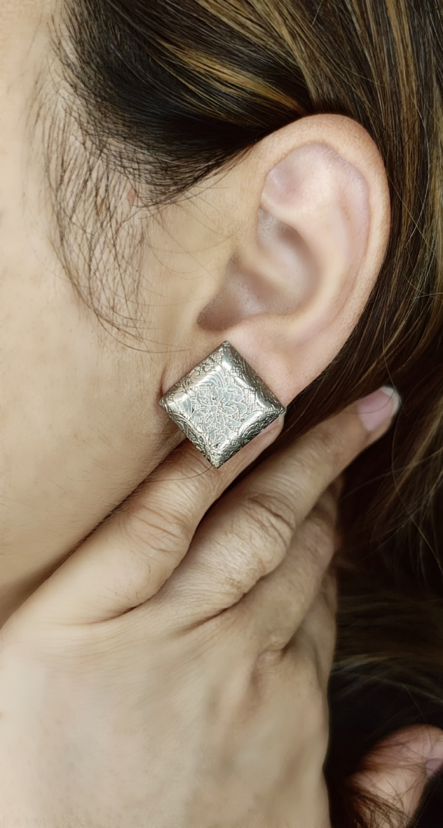Crafted on a brass base and finished with an antique oxidised silver sheen, these square studs feature intricate floral and vine engravings, inspired by the serenity of traditional Indian artistry. The subtle pattern catches light beautifully, making them an understated yet striking piece for everyday elegance or spiritual occasions.