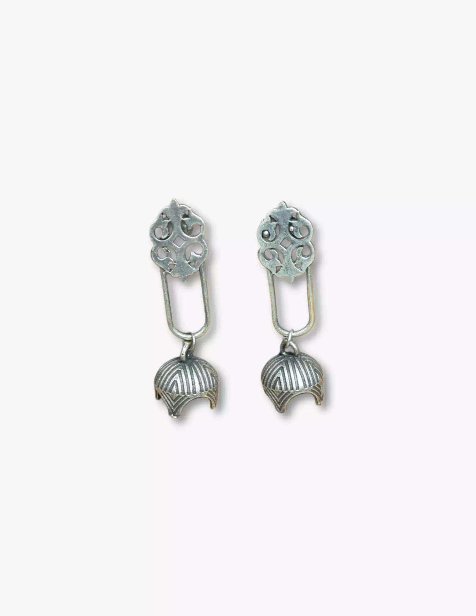 Elevate your style with these stunning silver oxidized drop earrings. Handcrafted with intricate filigree designs, these lightweight earrings add a vintage look to any outfit. The dangling bell-shaped charm features textured geometric patterns, giving it an elegant, traditional vibe.