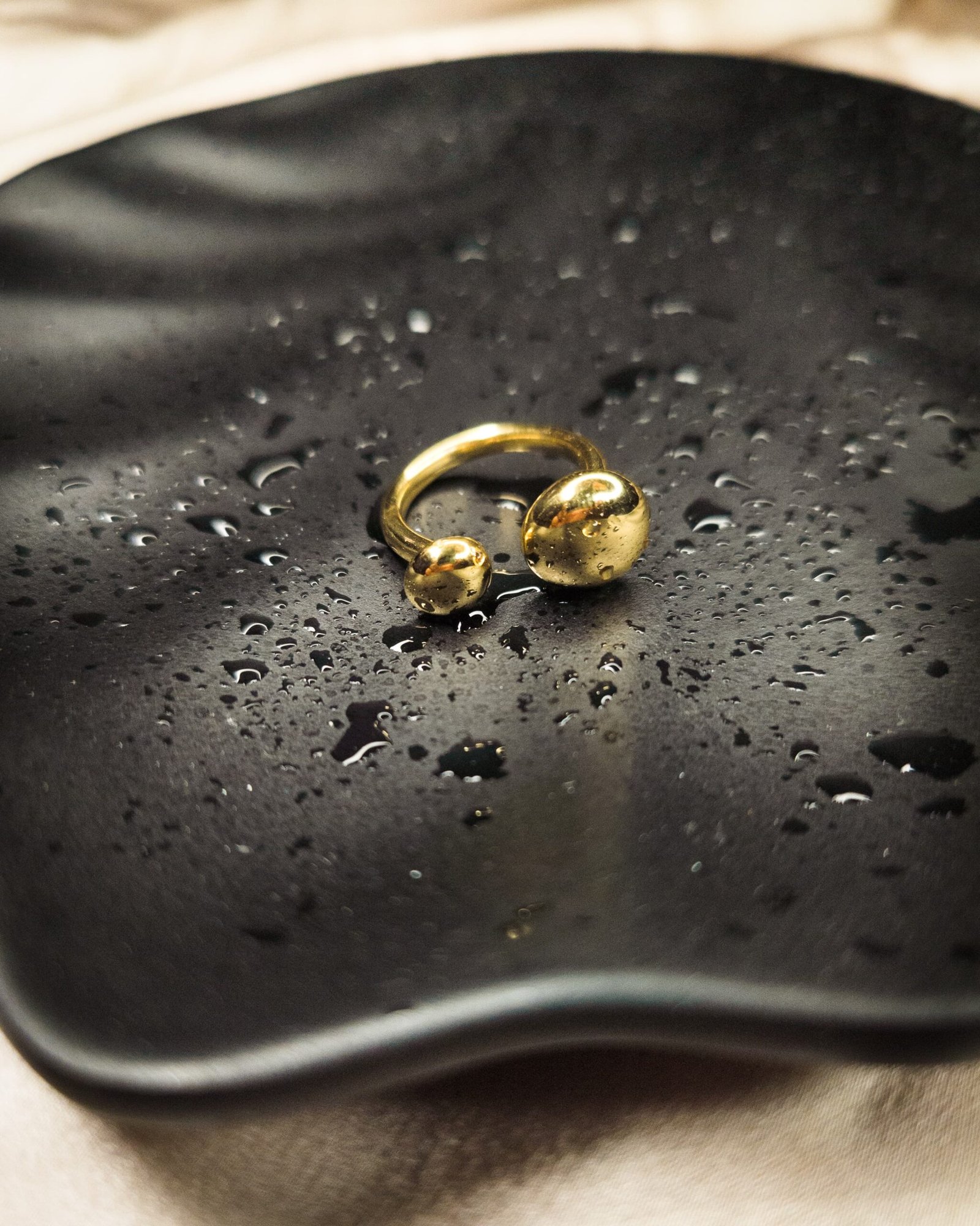 This shiny tarnish free gold plated open ring perfectly embodies the modern minimalist aesthetic. It’s subtle enough for everyday wear but still has that unique touch with the ball accents. The open design makes it a little adjustable too, which is always a bonus!