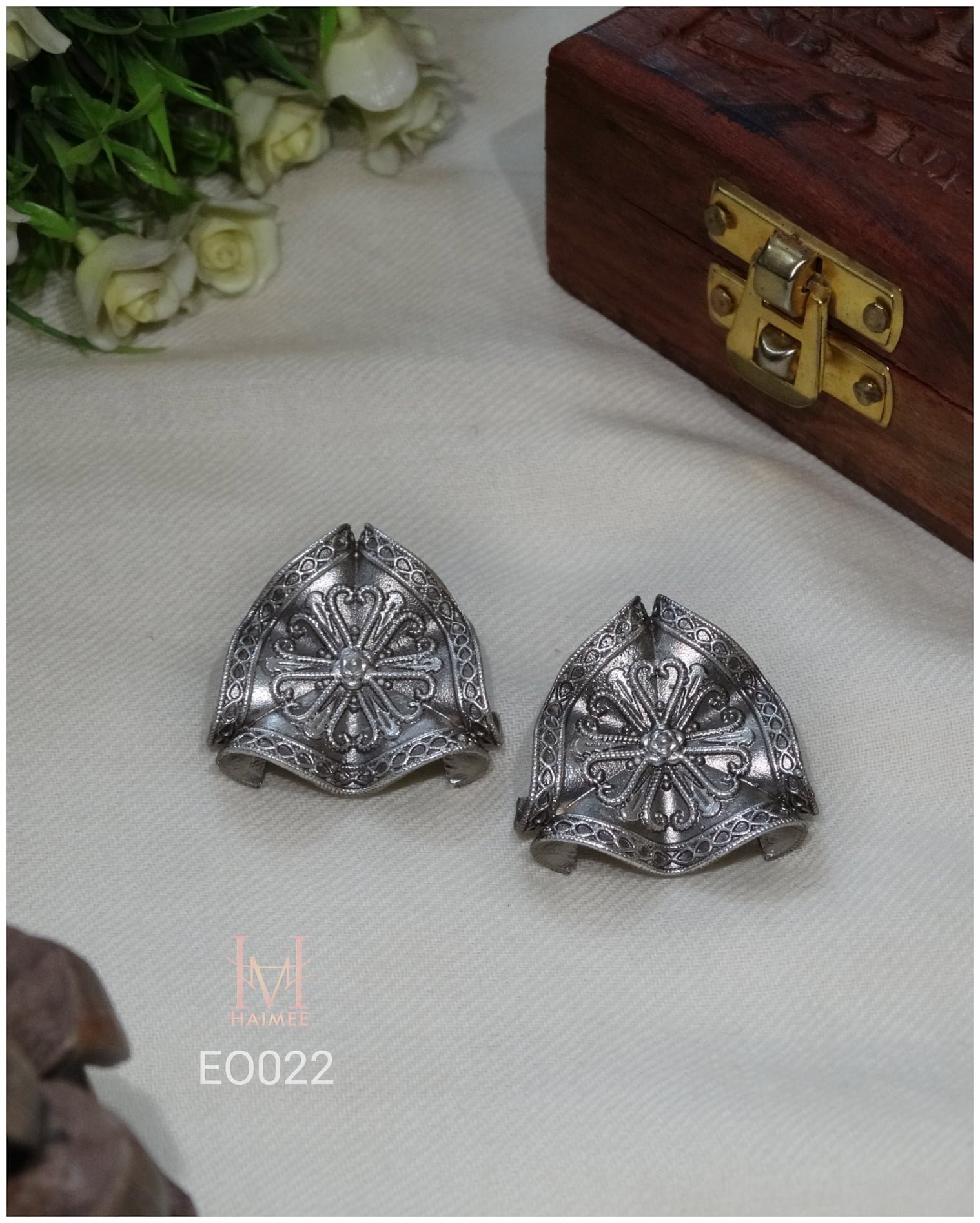Triangular Floral Silver Oxydised Stud Earrings – Vintage Gothic Indian Traditional Jewellery
